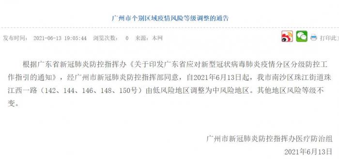 根据广东省新冠肺炎防控指挥办《关于印发广东省应对新型冠状病毒肺炎疫情分区分级防控工作指引的通知》,经广州市新冠肺炎防控指挥部同意,自2021年6月13日起,广州市南沙区珠江街道珠江西一路(142、144、146、148、150号)由低风险地区调整为中风险地区。其他地区风险等级不变。
