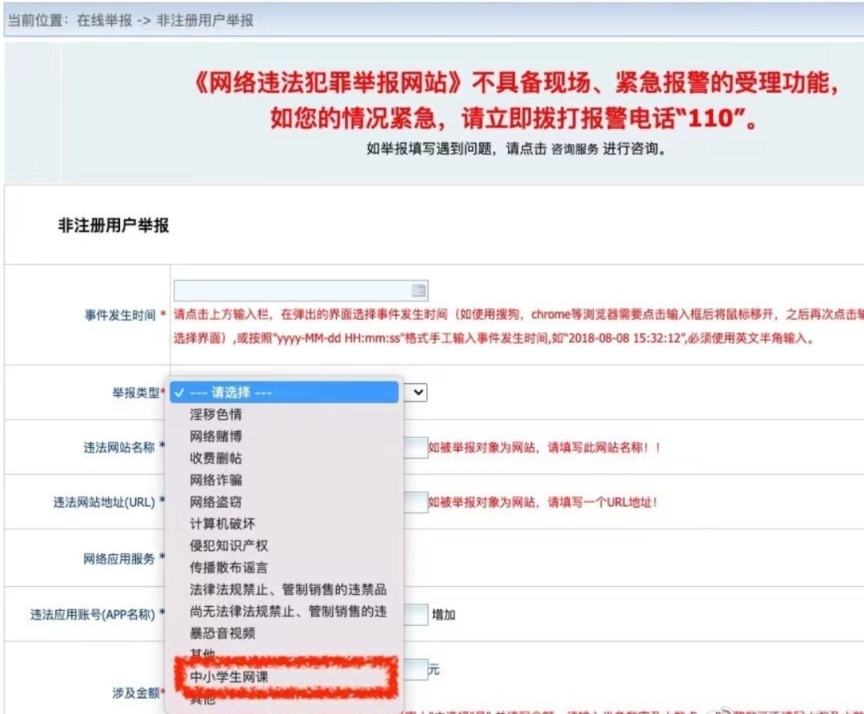 基金君查了一下,国家网络违法犯罪举报网站的确有这个选项,不过全称叫“中小学生网课中违法违规内容”。