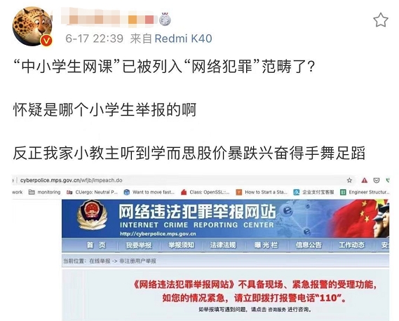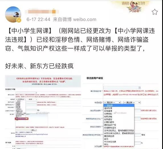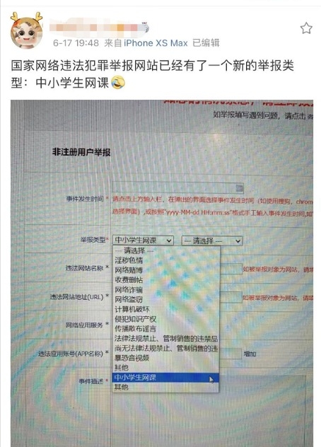 17日晚间,一张显示《网络违法犯罪举报网站》新增“中小学生网课”的举报类型的图片在网络上流传,引起网友们关注。