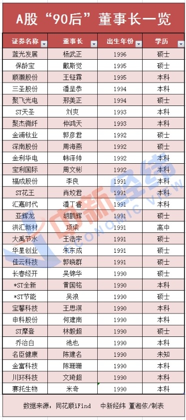 中新经纬客户端查询数据发现,目前A股市场上有30位上市公司董事长是“90后”,绝大部分是创始人的子女,最小的为1995年出生,最大的为1990年出生。