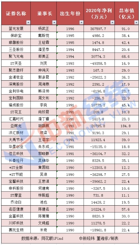 仅从2020年净利润来看,30家“90后”掌管的上市公司净利润最高的为“四川地产一哥”蓝光发展(36.76亿元),ST天圣则巨亏近5亿元。
