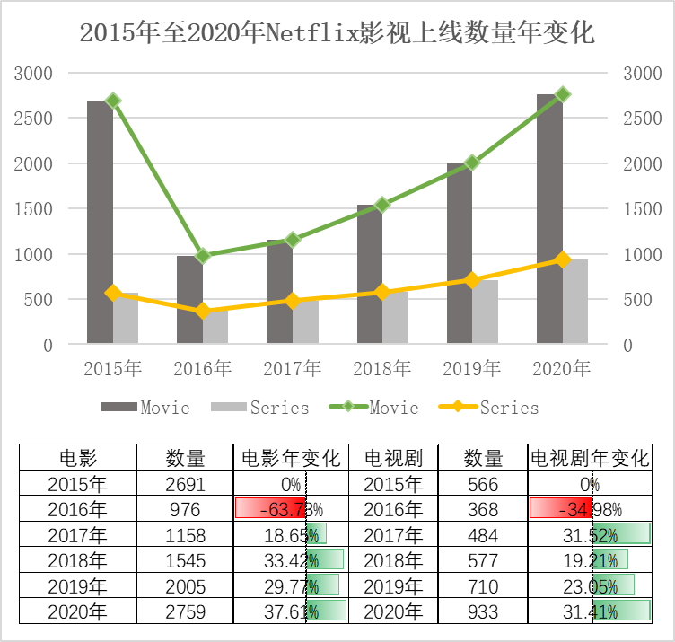从2015年到2020年,Netflix上线影视数量发生大幅度的波动。一降一升,变化的不只是数字,更以一种直观的方式展现了Netflix的转型之路。
