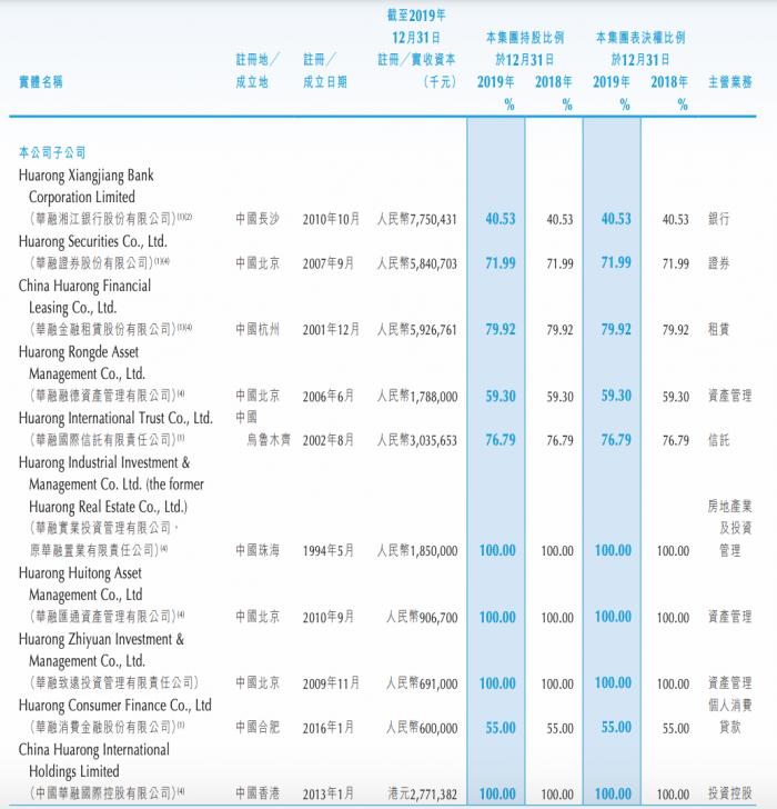 截至目前,中国华融还未发布2020年财报,2019年财报显示,其旗下拥有华融证券、华融金融租赁、华融湘江银行、华融信托、华融期货、华融融德、华融实业、华融国际、华融消费金融等多家平台子公司。