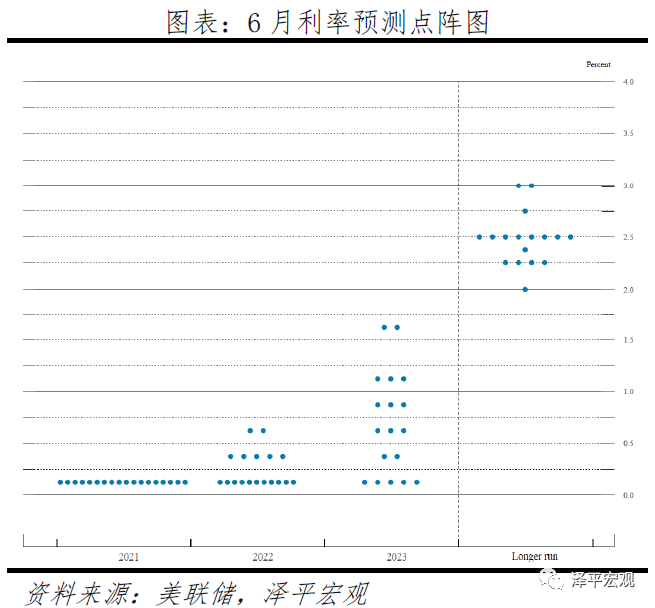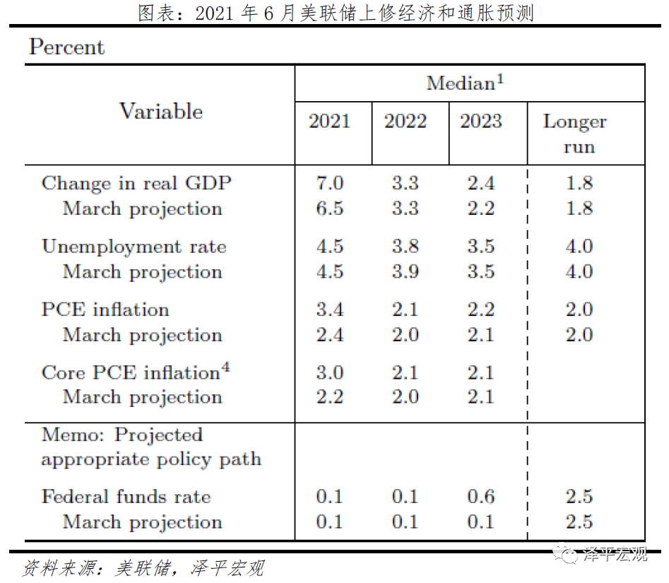 通胀方面,此次会议中美联储首次承认通胀持续上涨的现象,同时考虑到通胀的基数效应,本次通胀预期抬升意味着美联储认为下半年的通胀压力仍在。