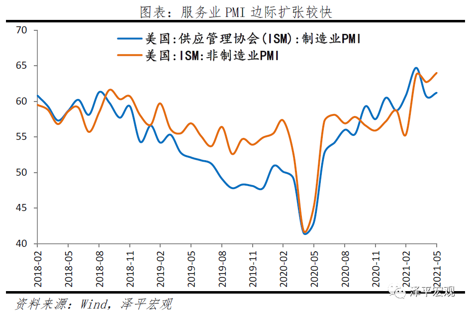 景气度方面,市场信心维持乐观,服务业恢复维持韧性。美国5月ISM制造业PMI为61.2%,ISM非制造业PMI为64%,均连续12个月位于景气区间。制造业PMI中订单边际抬升,表明经济恢复带动需求走高,产出边际回落但仍然位于高景气区间,自有库存回升但客户库存仍处于低位,供应商配送效率仍有待提高。总体上看,美国制造业需求旺盛,佐证经济恢复有所成效,制造业恢复得以确认;衡量美国服务业景气的非制造业PMI明显超出预期,各分项处于景气区间,说明服务业恢复仍在继续。