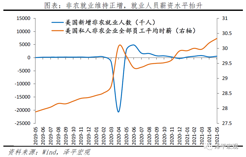 就业方面,需求旺盛但供给不足,救济政策退出将促进就业恢复。从整体就业数据来看,5月份美国新增非农就业55.9万人低于预期,失业率为5.8%,预期5.9%,劳动参与率录得61.6%低于预期,5月非农时薪环比上涨0.5%,预期上涨0.2%。具体来看,新增就业中服务业表现强劲,在疫苗接种成效体现的带动下,休闲和酒店业新增就业29.2万人,私人部门服务业领域本月新增就业48.9万人,新增就业贡献率达到88%,经济恢复重心偏向服务业可以确认;就业市场出现“就业人数增长+薪水走高”,从供需角度来看是需求旺盛但供给相对较弱所致,美国多州已现抬高失业救济门槛与逐渐停止失业援助金的政策。展望未来,劳动力供给有望改善,就业缺口或收窄,在经济恢复重心偏向服务行业的趋势下,服务业就业有望加速改善。