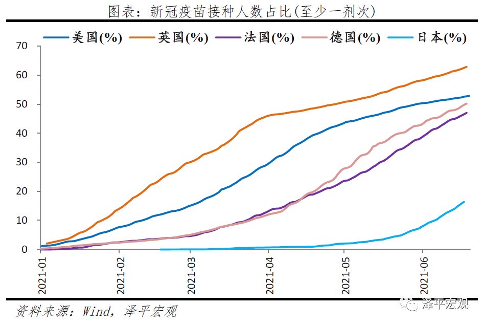 疫情方面,随着疫苗接种有序开展,美国疫情明显改善。美国每日新增确诊人数控制在1.5万人以内,较4月疫情反弹的高点明显回落,已处于疫情爆发后最低水平;接种疫苗人数占比已破50%,在发达国家中仍处于较高水平,考虑到美国人口基数远高于其他发达国家,美国的疫苗接种力度处于领先地位。