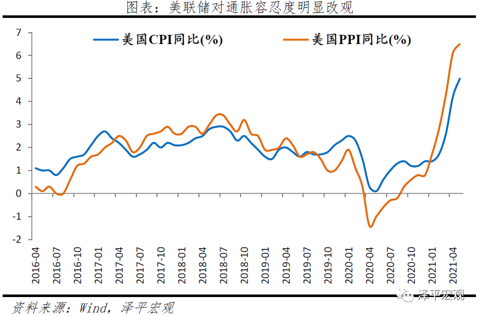 随着通胀的表现逐步由此前美联储所提到的“暂时性”的向“结构性”转变,也引发了美联储对于通胀容忍程度表态的变动。在整体对经济预测上修的同时,美联储对通胀的担忧也有所增加,认为通胀水平可能比预期中要产生更长时间的影响,因此,美联储不得不面临在逆周期调节政策影响下经济修复和美元流动性泛滥带来的短期通胀对长期通胀目标偏离的问题之间取得平衡。
