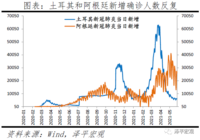 从世界的角度来看,若以100%的债务率,20%的负债率,100%的短债与外汇储备比为安全线进行测算的话,目前债务违约风险较大的国家有阿根廷、土耳其等国家。若同时考虑到经济基本面,货币超发、通货膨胀严重同时疫情反复的国家,阿根廷、土耳其以及埃及在过去一段时间中货币超发比较严重,导致国内通胀高企。此外,土耳其和阿根廷的疫情反复均较严重,未来经济恢复前景堪忧。