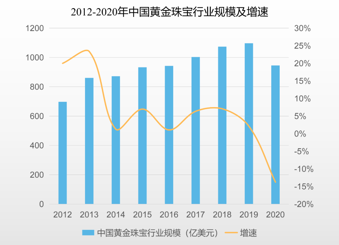 据商业地产头条统计的《2012-2020年中国黄金珠宝行业规模及增速》显示,2014年国内珠宝行业的增速急转直下,2020年甚至出现了负增长,行业规模也一度缩水至不足千亿美元。