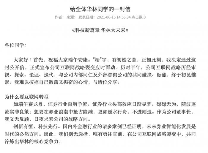在公告新总裁履任的当天,董事长林立对公司全员发了公开信,宣布了公司的互联网战略。并以互联网人的口吻,将华林证券的员工称为“华林同学”。