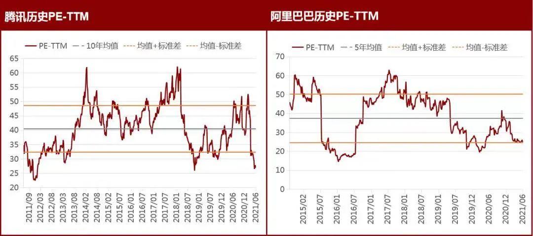 从基本面看,虽然在高基数影响下互联网公司2021年下半年仍有一定的业绩压力,但企业整体竞争力仍然较强。当前行业龙头公司估值已处于过去十年的较低水平。根据分析师一致预期,2021和2022年腾讯归母净利润将分别同比增长0.37%和20.06%,阿里巴巴归母净利润将分别同比增长6.99%和21.84%,2021年腾讯、阿里对应PE为29倍和24倍,均处于历史的中低分位,风险收益比较高。