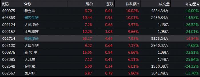 6月28日,猪肉股集体大涨。至午后13:15左右,新五丰、傲农生物、天邦股份涨停,牧原股份涨幅接近9%。