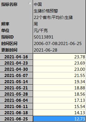 Wind数据则显示,截至6月25日当周,国内22省市生猪平均价已跌至12.73元/公斤。这一价格,已经击穿了绝大部分的生猪养殖企业的成本线。