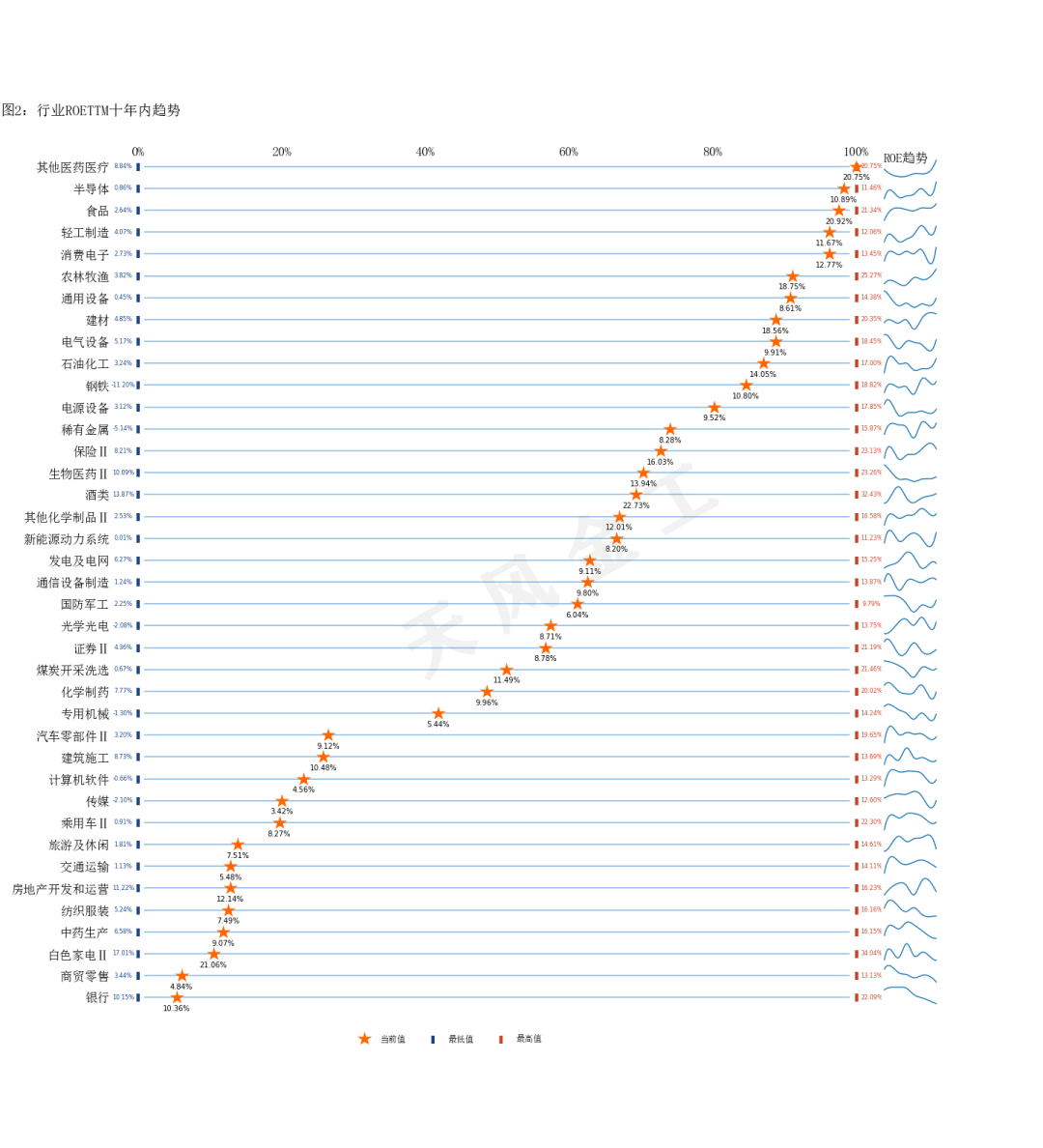 目前,其他医药医疗、半导体、食品的ROETTM处于过去十年的高点,银行、商贸零售、白色家电Ⅱ的ROETTM处于过去十年的低点。