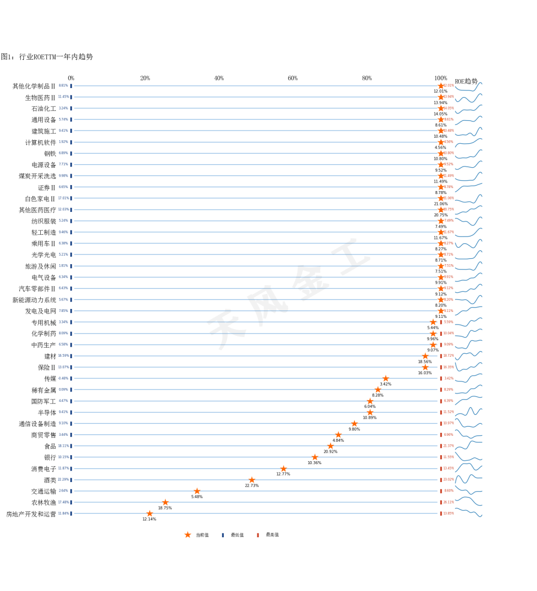 目前,其他化学制品Ⅱ、其他医药医疗、发电及电网的ROETTM处于过去一年的高点,房地产开发和运营、农林牧渔、交通运输的ROETTM处于过去一年的低点。