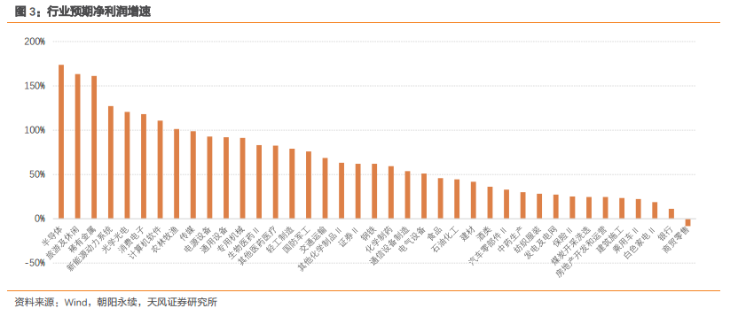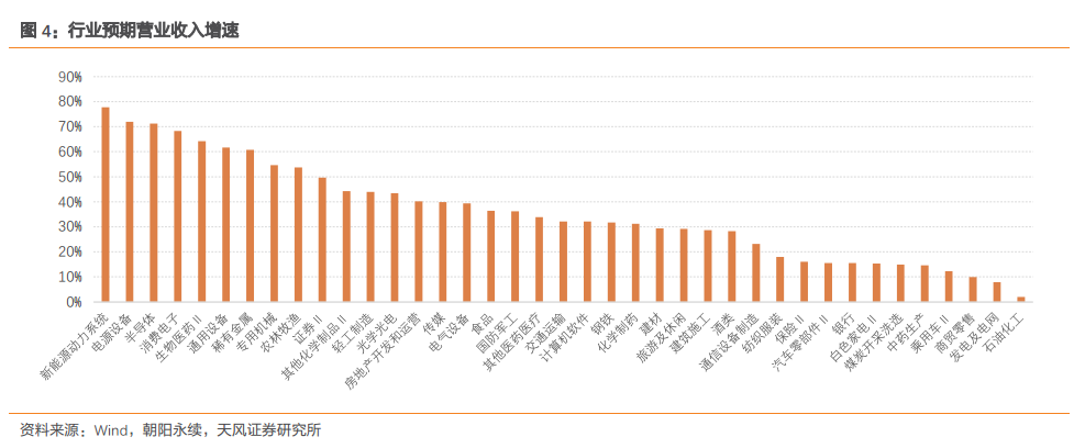 下表为当前行业预期营业收入增速。目前,从预期营业收入增速来看,新能源动力系统、电源设备、半导体行业的景气度较高,石油化工、发电及电网、商贸零售行业的景气度较低。