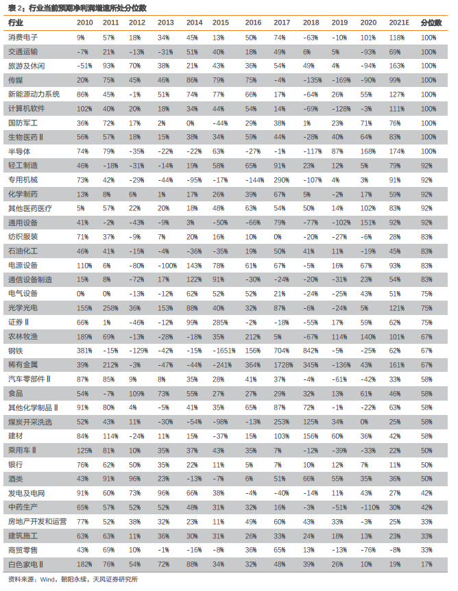 下表展示了各行业2010年以来各年度的净利润相对于过去三年平均净利润的增速,并且统计了行业当前预期净利润增速在历史增速中所处的分位数。消费电子、新能源动力系统、生物医药Ⅱ行业处于较高水平,白色家电Ⅱ、房地产开发和运营、商贸零售行业处于较低水平。