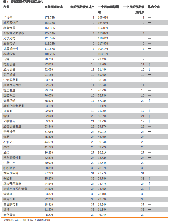 下图为当前行业预期净利润增速及相对于一个月前的变化。