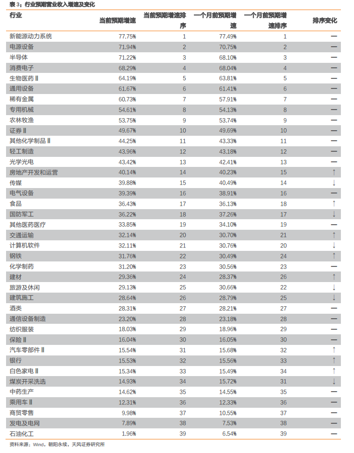 下表为当前行业预期营业收入增速及相对于一个月前的变化。