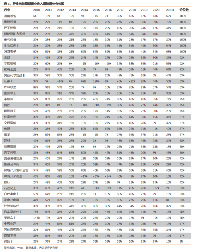 下表展示了各行业2010年以来各年度的营业收入相对于过去三年平均营业收入的增速,并且统计了行业当前预期营业收入增速在历史增速中所处的分位数。通用设备、电源设备、轻工制造行业处于较高水平,保险Ⅱ、中药生产、商贸零售行业处于较低水平。
