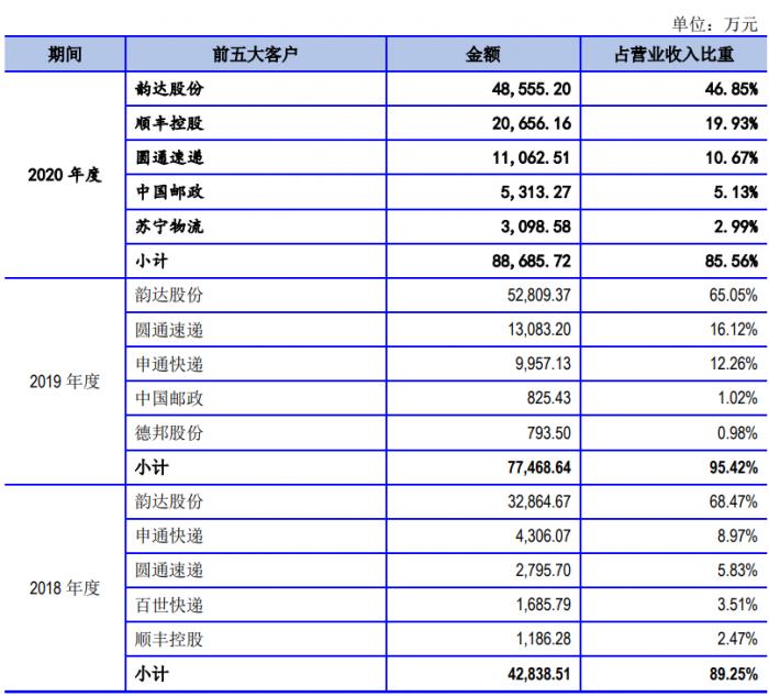 按同一实控人合并口径计算,欣巴科技来源于前五大客户的收入占公司营收的比重分别达89.25%、95.42%和85.56%,其中来自于韵达股份的收入占比分别达68.47%、65.05%和46.85%。