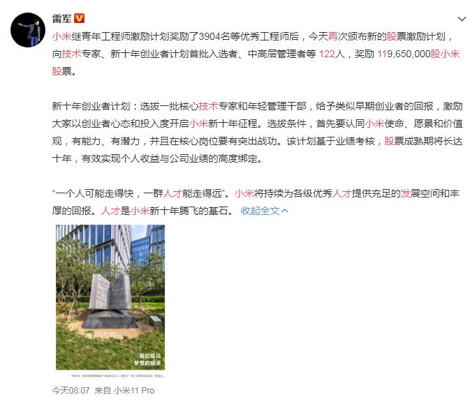 谈及小米连续发布的激励计划,小米集团董事长,创始人兼CEO雷军在其微博中称:“一个人可能走得快,一群人才能走得远”。小米将持续为各级优秀人才提供充足的发展空间和丰厚的回报。人才是小米新十年腾飞的基石。