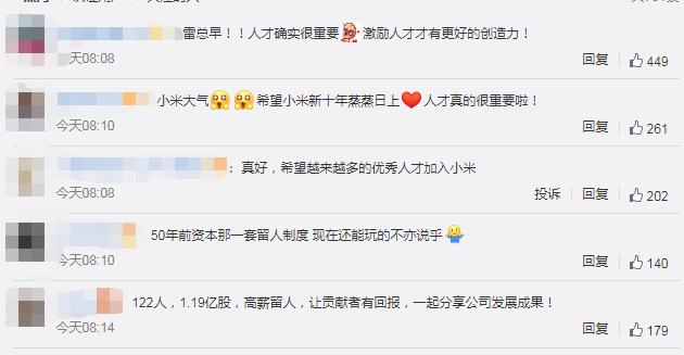 小米接连发布股票激励,引发热议,不少网友直呼羡慕。有网友表示激励有助于提升创造力,认为小米的做法是高薪留人很大气;也有网友调侃,小米在业内出了名字工资低,很明显是在留人、抢人。