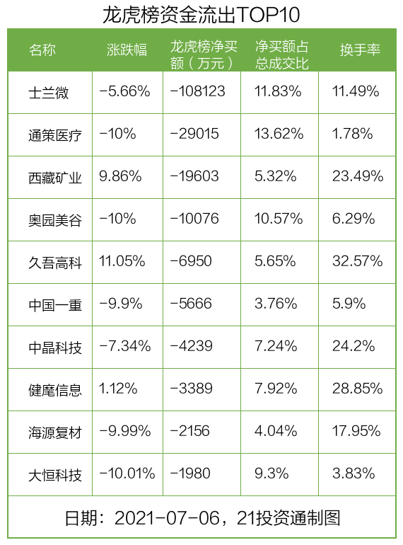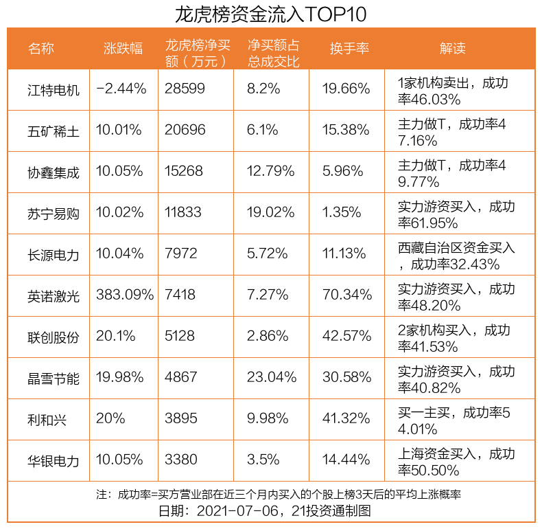 7月6日,上证指数下跌0.11%,深证成指下跌0.35%,创业板指下跌1.79%。盘后龙虎榜数据显示,共有45只个股因当日异动登上龙虎榜,资金净流入最多的是江特电机(002176.SZ),达2.86亿元。