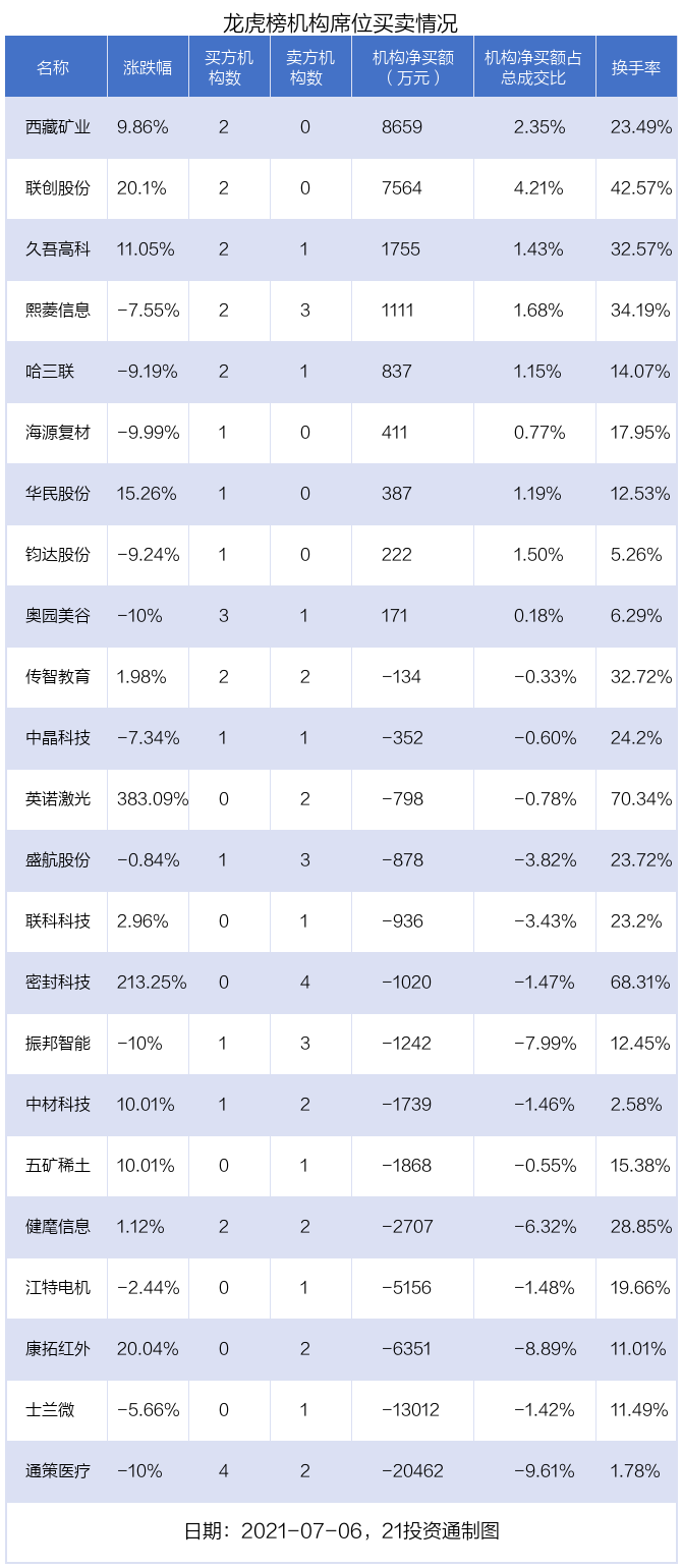7月6日,23只个股龙虎榜出现了机构的身影,机构合计净卖出3.55亿元。具体来看,机构净买入9股,净卖出14股。