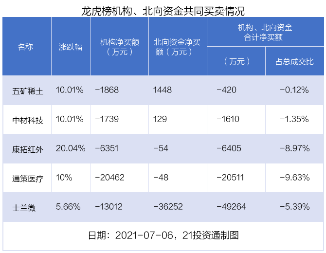 值得注意的是,机构和北向资金共同净卖出了通策医疗、康拓红外、士兰微等3股;在五矿稀土,中材科技上出现分歧,机构净卖出五矿稀土1868.05万元,北向资金净买入1447.56万元;机构净卖出中材科技1739.16万元,北向资金净买入129.06万元。