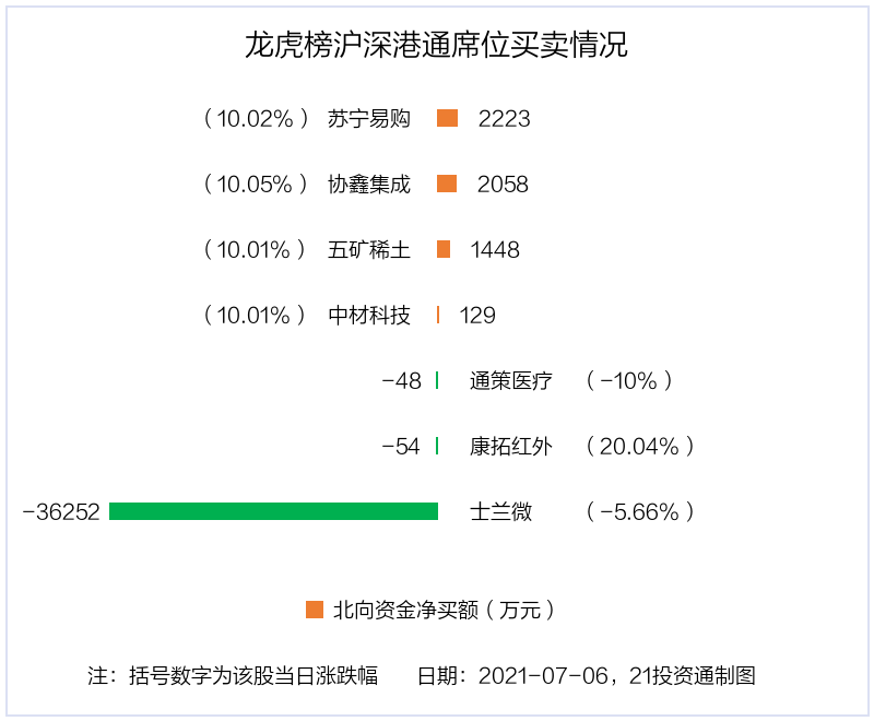 7月6日,北向资金参与龙虎榜中的个股共有7只,合计净卖出3.05亿元。其中沪股通净卖出2 股,合计净卖出3.63亿元;深股通净买入4 股,净卖出1 股,合计净买入5803.05万元。
