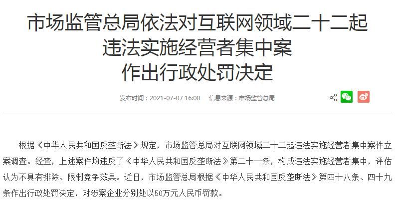 根据《中华人民共和国反垄断法》规定,市场监管总局对互联网领域二十二起违法实施经营者集中案件立案调查。经查,上述案件均违反了《中华人民共和国反垄断法》第二十一条,构成违法实施经营者集中,评估认为不具有排除、限制竞争效果。近日,市场监管总局根据《中华人民共和国反垄断法》第四十八条、四十九条作出行政处罚决定,对涉案企业分别处以50万元人民币罚款。