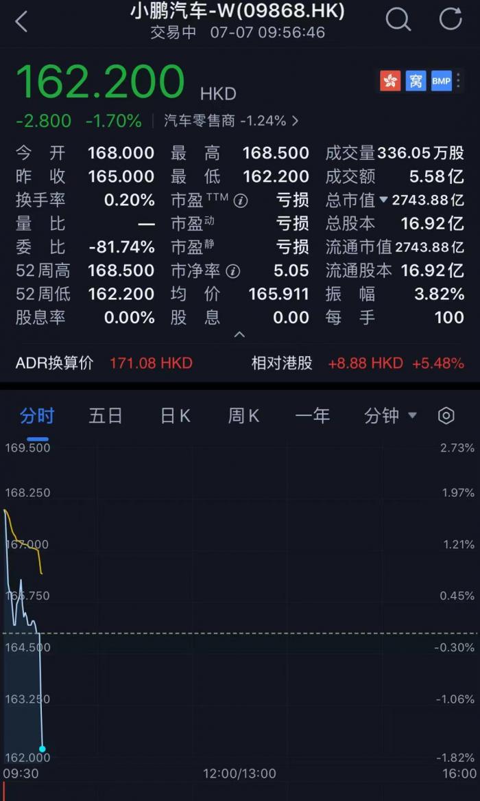 7月7日,新能源汽车第一股小鹏汽车在港交所上市,股价高开1.82%,而后逐步下挫盘中破发,截至9:56分许,股价报162.2港元/股,发行价为165港元,总市值约2790亿港元。