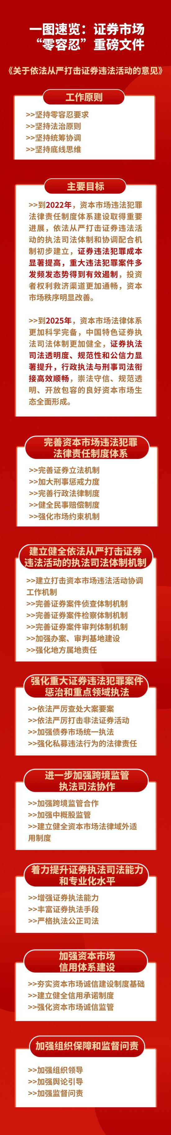中共中央办公厅、国务院办公厅6日公开发布了《关于依法从严打击证券违法活动的意见》,对建立健全资本市场执法司法体制机制、依法从严打击证券违法活动、推动资本市场高质量发展作出重要部署。