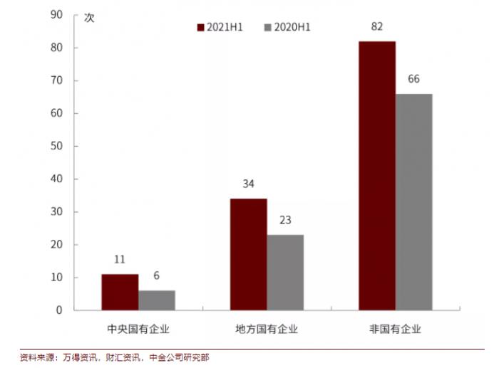 国企信仰动摇之下,今年上半年国有企业(包括中央国有企业、地方国有企业)发行人的负面评级行动次数较去年同期明显上升。据中金相关研报统计,中央国有企业的负面评级行动次数由2020年上半年的6次上升至11次,涉及华融系、中铝国际/中铝国工等发行人;地方国有企业的负面评级行动次数由2020年上半年的23次上升至34次,主要由城投、航空等行业发行人贡献。非国有企业(包括民营企业、中外合资企业等)2021年上半年的负面评级行动次数也较去年同期有所上升,不过上升幅度不及国企上升幅度。