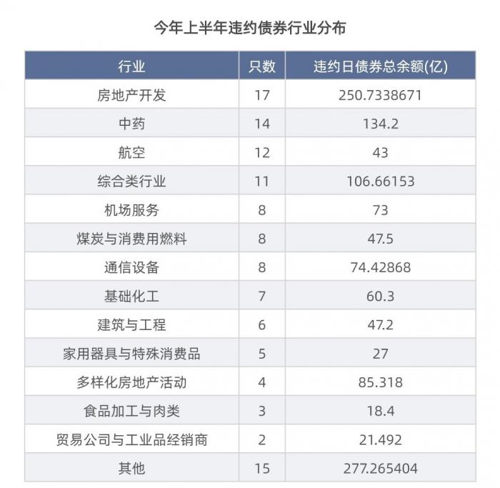 从今年上半年违约债券的行业分布来看,据Wind数据,房地产开发行业违约债券只数最多,达到17只,违约日债券总余额达250.73亿,主要是北京某大型开发商和泰禾集团违约规模较大。其次是中药行业,违约债券有14只,违约日债券总余额达134.2亿,主要是广东某药企债券陆续到期违约所致。