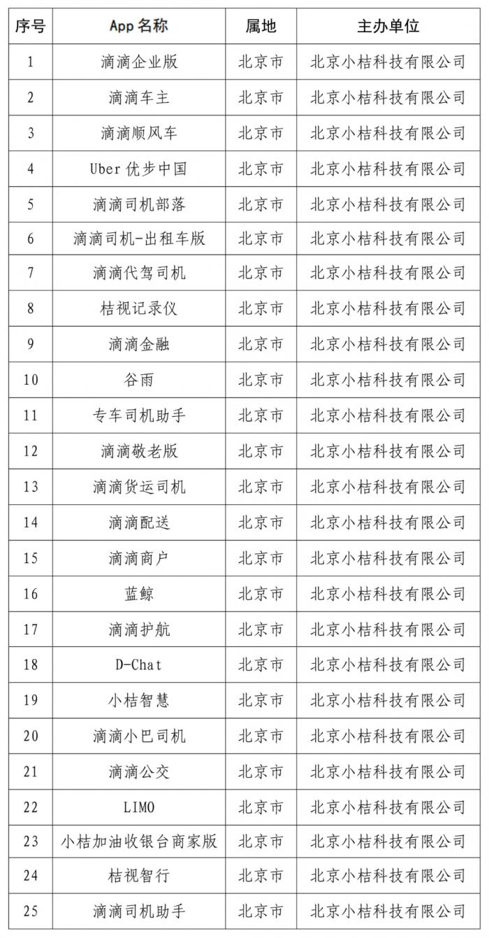 根据举报,经检测核实,“滴滴企业版”等25款App(列表附后)存在严重违法违规收集使用个人信息问题。国家互联网信息办公室依据《中华人民共和国网络安全法》相关规定,通知应用商店下架上述25款App,要求相关运营者严格按照法律要求,参照国家有关标准,认真整改存在的问题,切实保障广大用户个人信息安全。各网站、平台不得为“滴滴出行”和“滴滴企业版”等上述25款已在应用商店下架的App提供访问和下载服务。