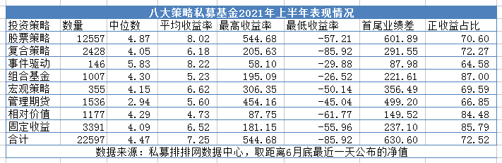 上半年,超七成私募基金实现正收益。私募排排网数据显示,截至6月底,纳入统计的22597只成立满6个月的私募基金,年内整体收益为7.25%,中位数为4.47%。其中,72.52%的私募基金实现正收益。