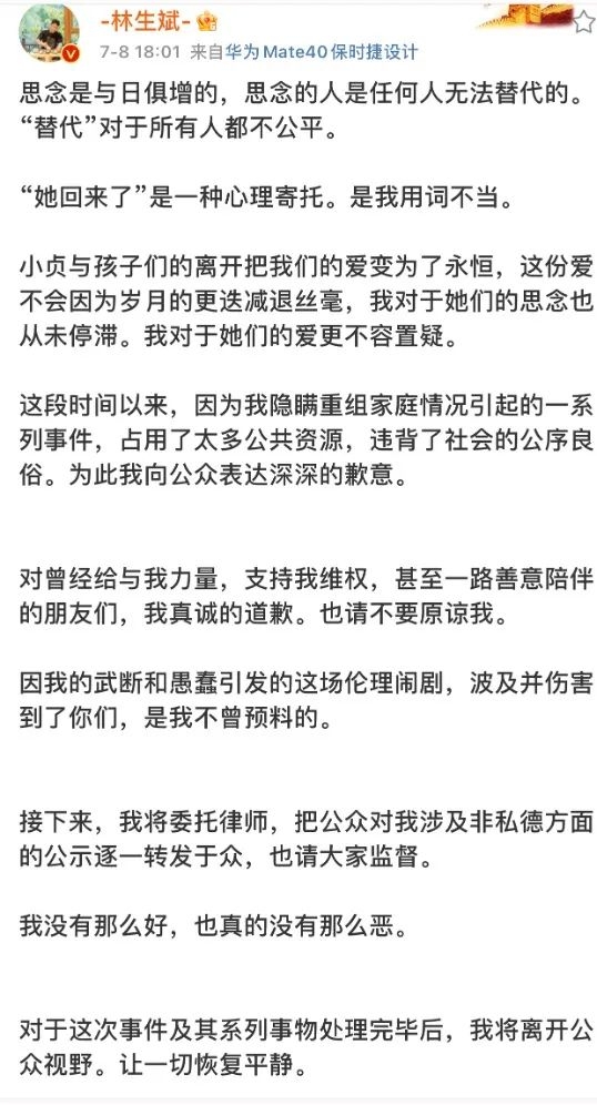 7月8日晚,林生斌在微博再度发长文回应,称将委托律师把涉及非私德方面的公示逐一转发于众,并表示将在事件处理完毕后离开公众视野。