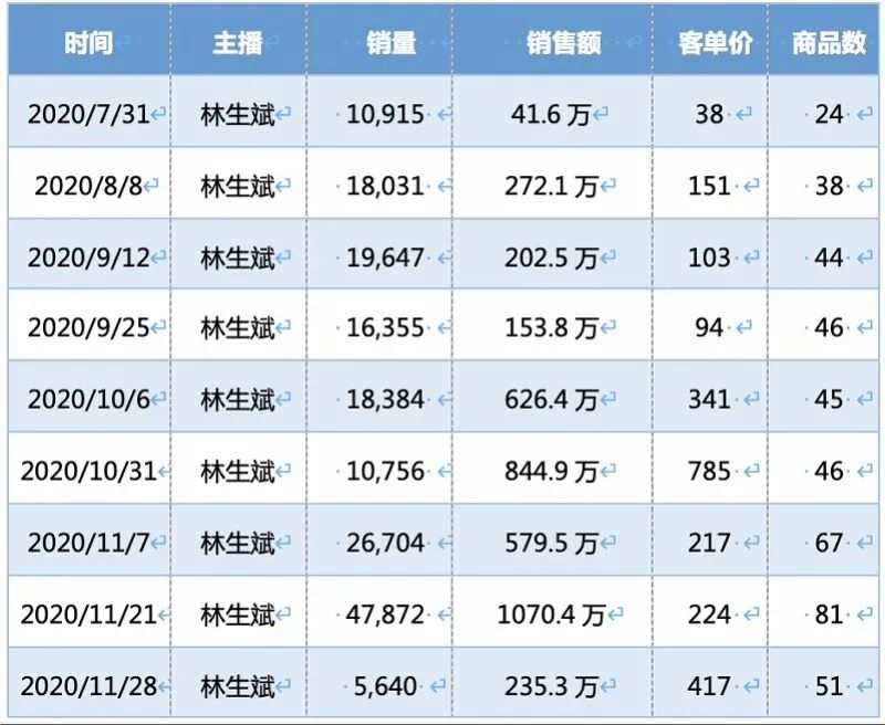 去年10月、11月,林生斌单月销售额分别达1471.2万元、1885.1万元,这也是销售额最高的两个月。林生斌最近一次直播在今年6月26日,单场直播销售额79.8万元。