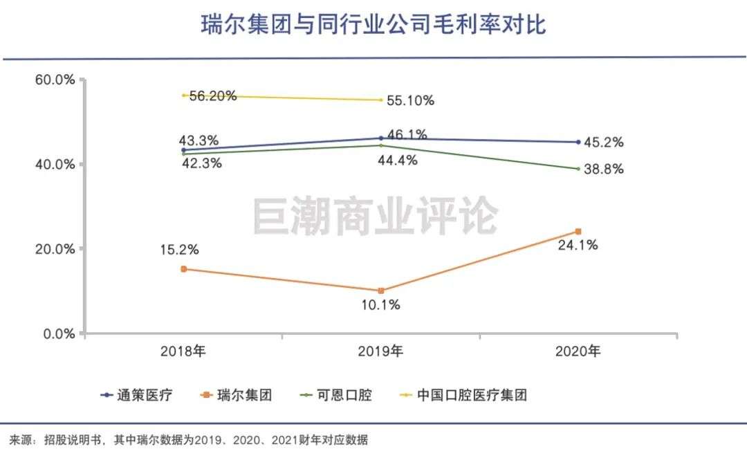 招股说明书显示,截至2021年3月31日止,瑞尔集团2019-2021财年的毛利率分别只有15.2%、10.1%和24.1%,这一数字不仅仅远低于牙科牛股通策医疗,也明显低于可恩口腔、中国口腔医疗集团等中小型牙科连锁医院。