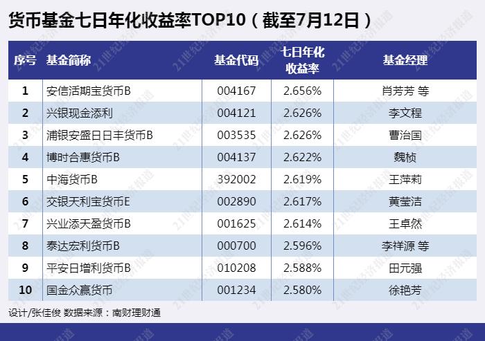 截至7月12日,整体上货基七日年化收益率要低于现金管理类产品,货币基金七日年化收益率榜单前十名中未有七日年化收益率高于3%的产品,本次榜单排名第一的货基“安信活期宝货币B”七日年化收益率为2.656%。