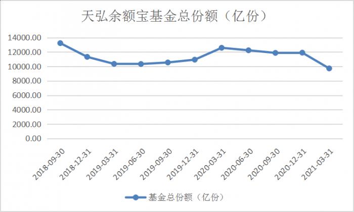 大家熟悉的余额宝收益率也早已下滑至2%附近,7月12日天弘余额宝(000198)的七日年化收益率为2.0670%。Wind数据显示,截至2021年3月31日,天弘余额宝基金规模为9724.15亿元,这一数据相较于2020年底的11908.16亿元有所压降。整体来看,自2020年3月31日以来,天弘余额宝呈现规模下滑趋势。