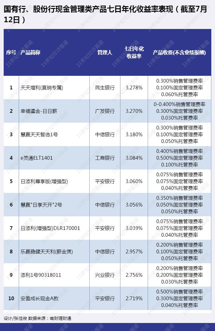 截至7月12日,从国有行、股份行现金管理类产品七日年化收益率来看,股份行现金类表现较为抢眼,国有行中仅工商银行有产品上榜。本次榜单中,民生银行“天天增利(直销专属)”七日年化收益率3.278%占据榜首。