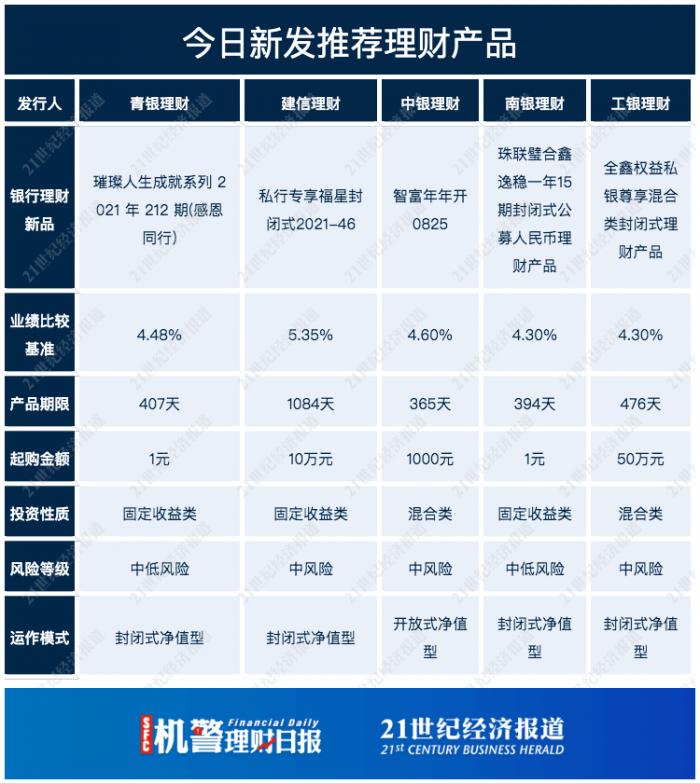 理财新品方面,据南财理财通数据显示,建信理财推出的“私行专享福星封闭式2021-46”产品业绩比较基准为5.35%,该产品针对建行财富管理级及以上的个人投资者,认购起点为10万元,其他个人合格投资者认购金额为600万元,产品期限为1084天,募集期从7月14日至7月20日。
