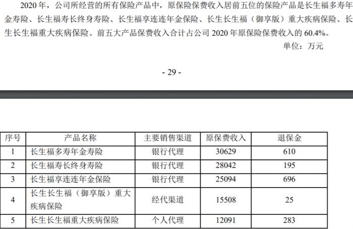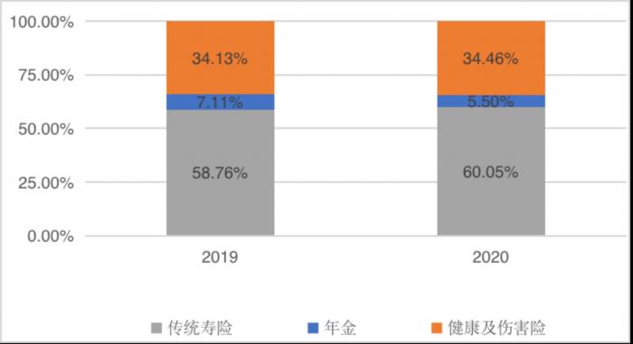 其中,在保险业务上,长生人寿的保险业务收入可归为传统寿险、年金险和健康及意外伤害保险等。相较2019年,长生人寿2020年的传统寿险业务收入增加至60%,健康和意外险34%基本不变,年金险由7%降至5.5%。