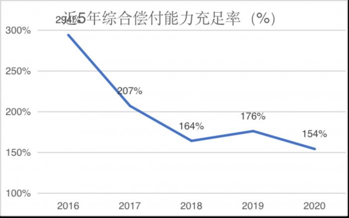 此外,对于长生人寿的偿付能力,近5年综合偿付能力充足率持续走低至154%。
