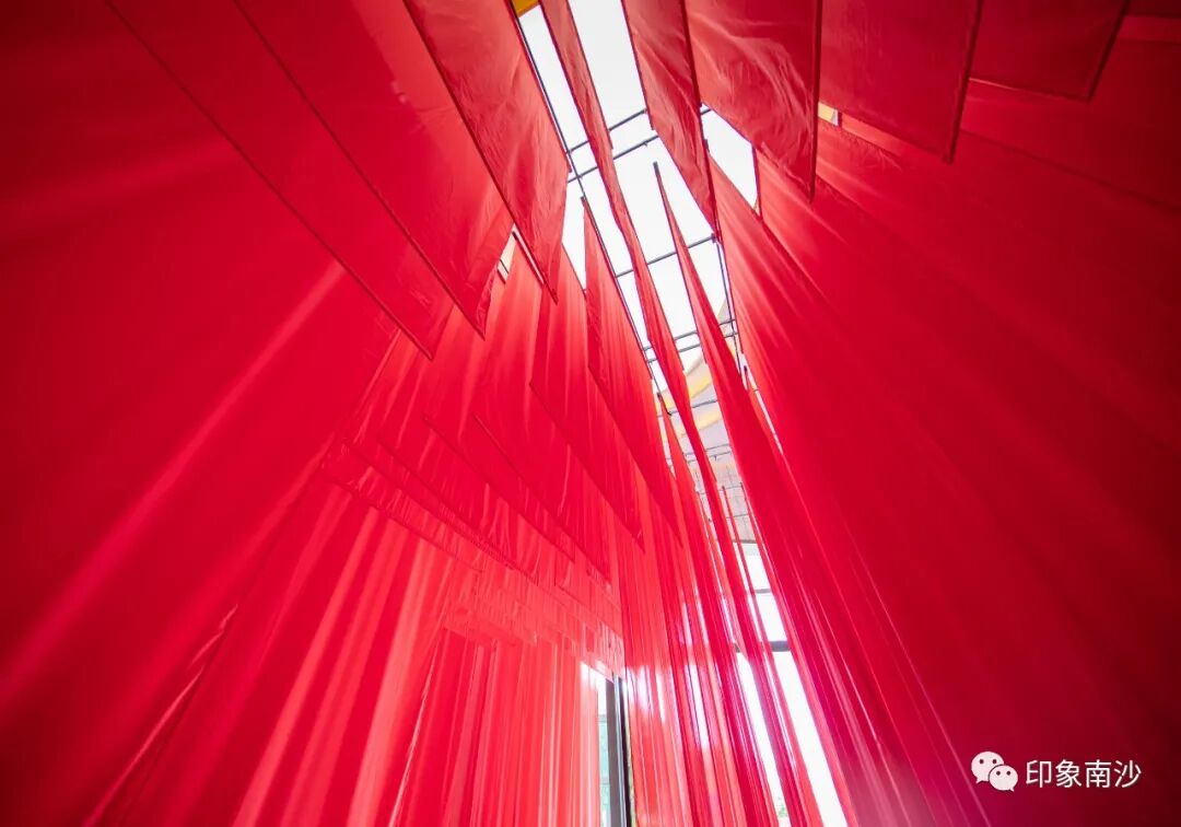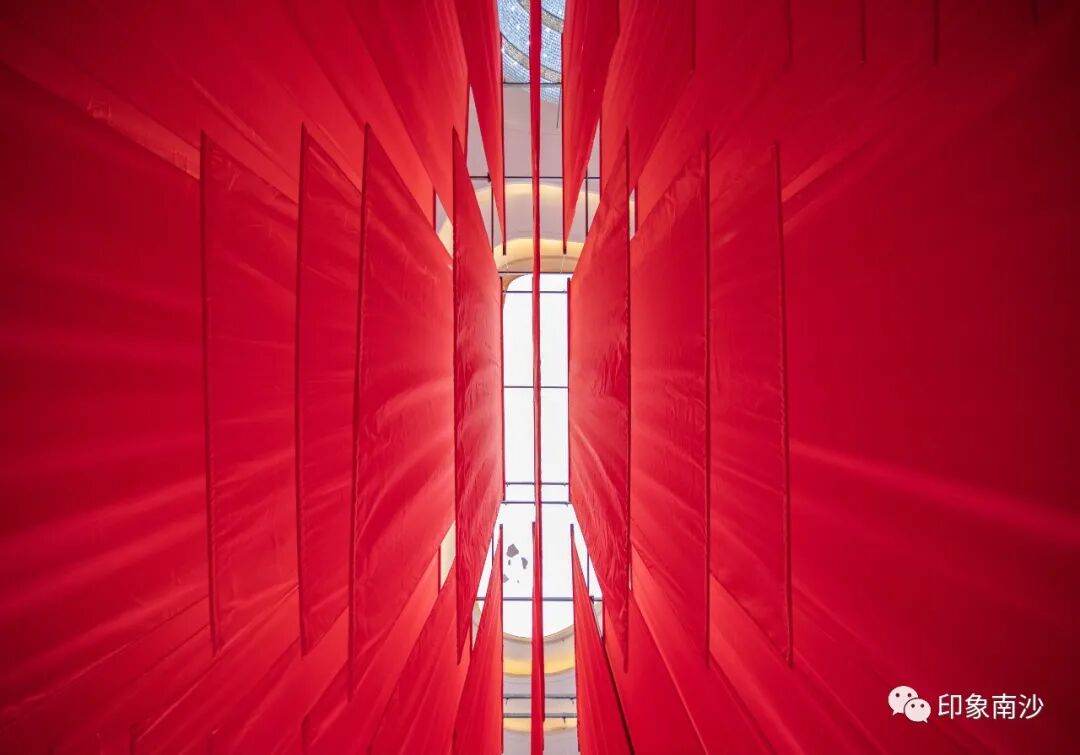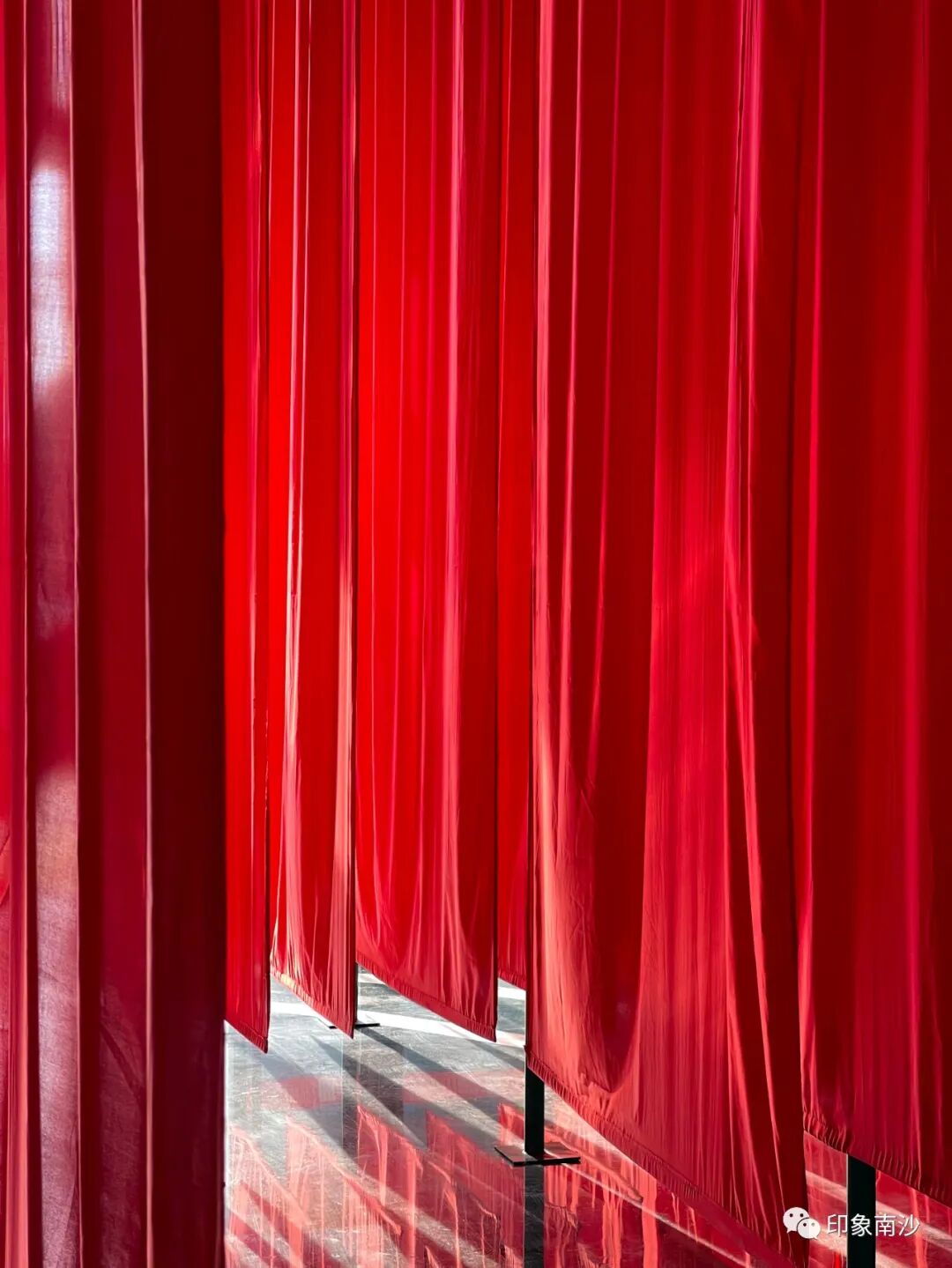 展览艺术装置《百年红》,以100面象征着国旗的红布,构成了展览的入口,通过极具仪式感布置,营造出一条并非一帆风顺的路径,象征着建党百年中可歌可泣的坎坷道路,感悟百年峥嵘,路途跌宕。