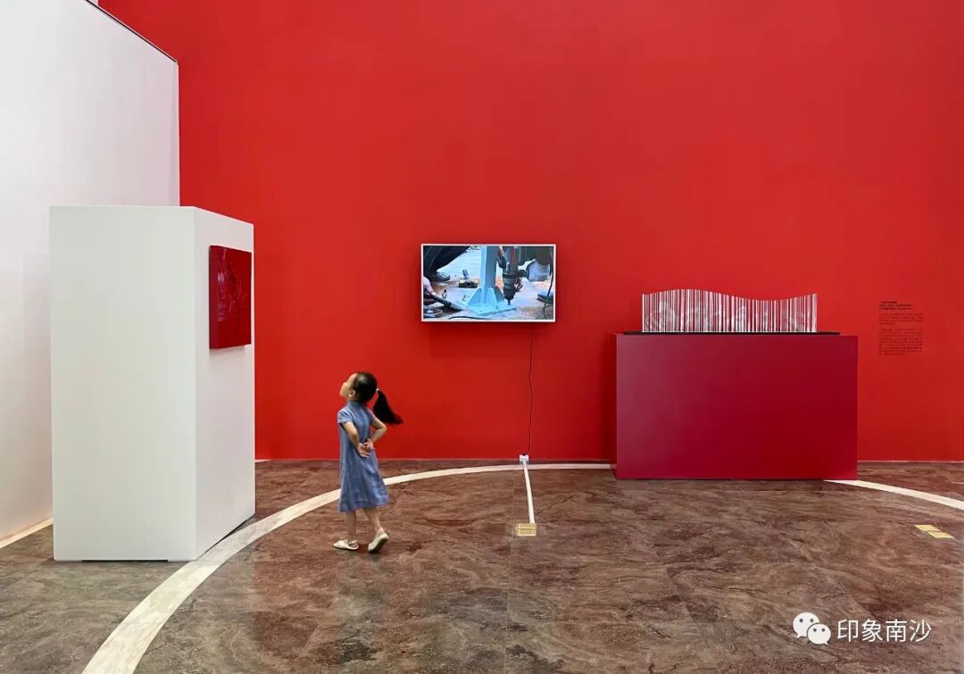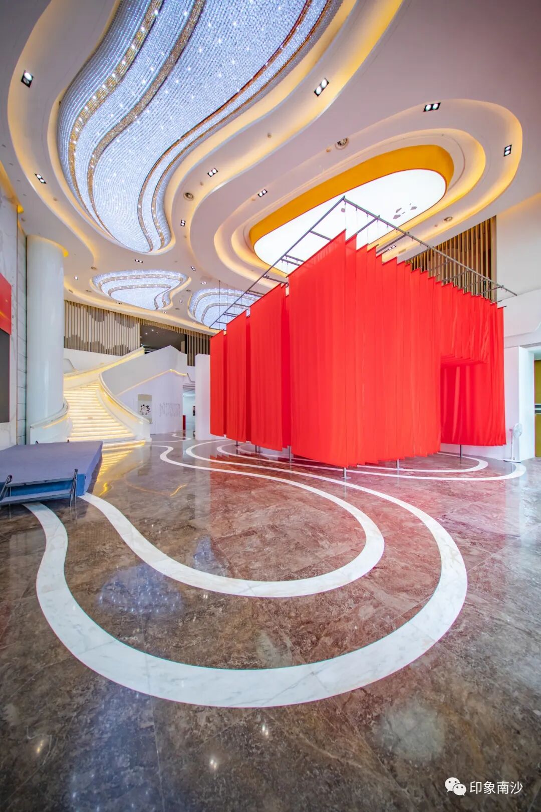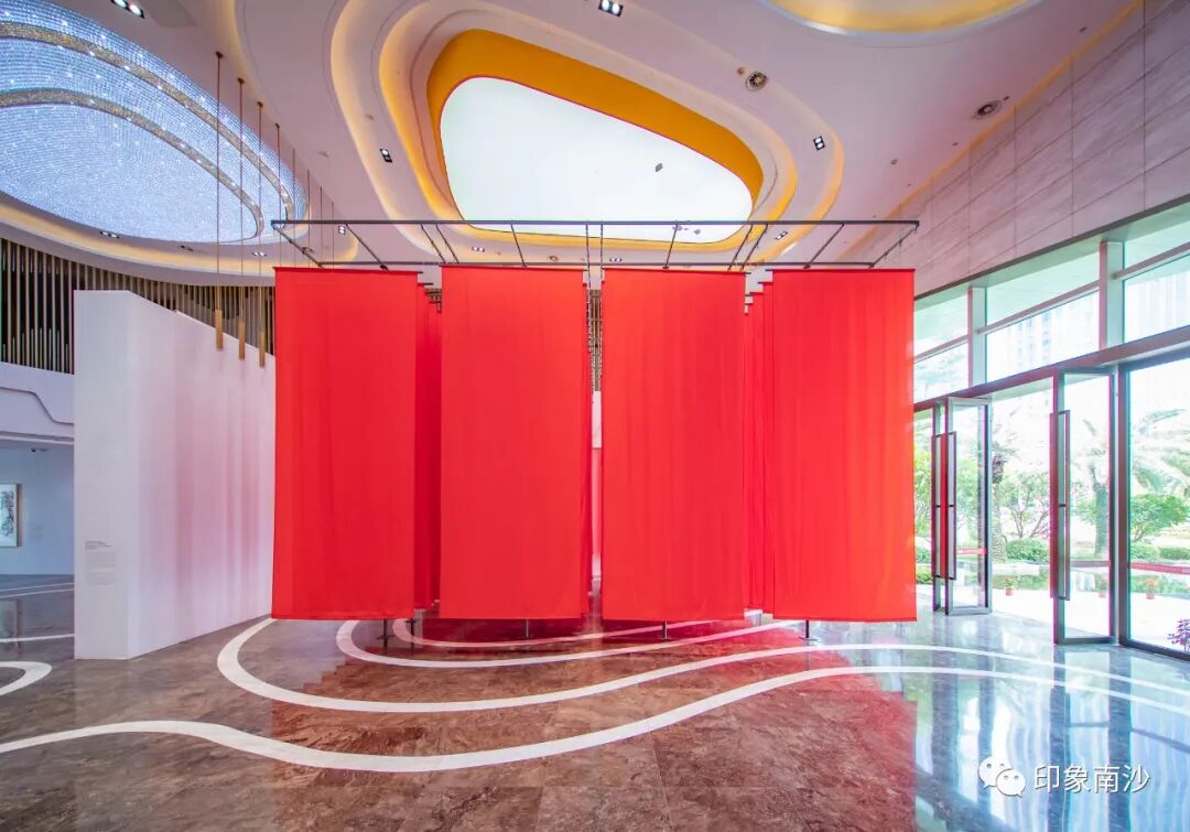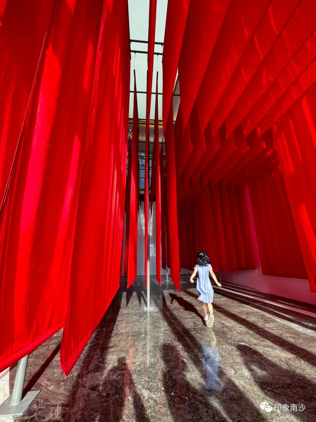 展览艺术装置《百年红》,以100面象征着国旗的红布,构成了展览的入口,通过极具仪式感布置,营造出一条并非一帆风顺的路径,象征着建党百年中可歌可泣的坎坷道路,感悟百年峥嵘,路途跌宕。